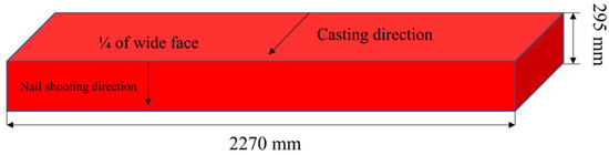 In this paper, the accuracy of the solidification heat transfer model is verified by the nail shooting experiment. The installation position of the nail shooting device is at the end of segments 8, 9, and 10 of the caster (the distances from the meniscus are 24.63 m, 27.22 m, and 29.77 m, respectively), which are located above one quarter of the broad surface of the slab, and the length of the nail is 200 mm. The nail shooting position is shown in the Figure 3.