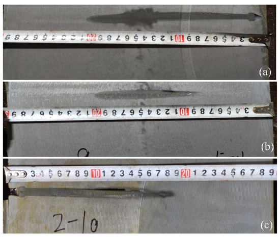 Photographs of sulfur printing samples for nail shooting experiments on S-4 steel: (a) The end of segment 8; (b) the end of segment 9; (c) the end of segment 10.