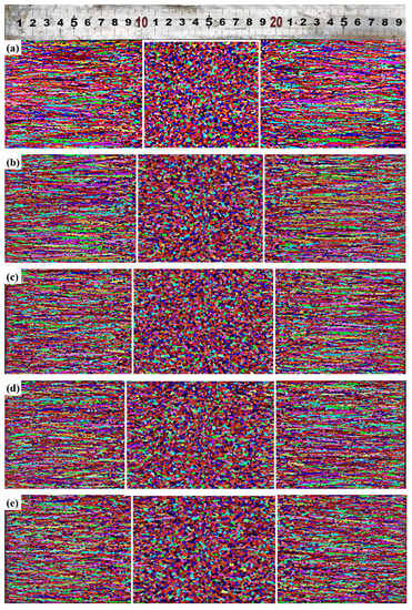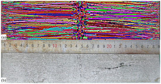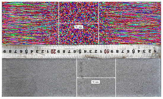 Figure 6 shows the comparison of the numerical and experimental solidification structures of S-1 steel. Different colors in Figure 6 represent grain orientation. The ECR of the slab is about 24.41%, while the calculated ECR is also 25.42%. The experimental and simulated equiaxed crystal ratios are almost identical, which indicates the model used in this study can better simulate the evolution of the solidification structure of the slab, and that the model used is reasonable.