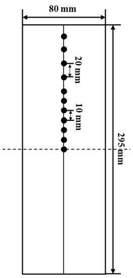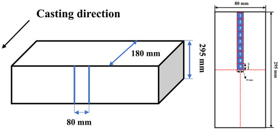 Nine samples are taken from the surface to the center of the slab, as shown in Figure 8. The etching solution, V(HNO3):V(C2H6O) = 5:95, is used to etch the dendrite and observed under a metallographic microscope. The average SDAS of each sample is measured at 50 times magnification. Micrographs of the samples are shown in Figure 9.