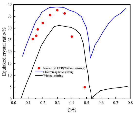 - With the increase in carbon content, the ECR increases at first, and then decreases. The ECR reaches the maximum value when the carbon content is 0.3%. When the carbon content is about 0.53 wt%, the equiaxed crystal rate reaches the lowest value. Therefore, in the actual production, within the acceptable range of carbon content, the content of C can be controlled by this rule to improve the ECR.