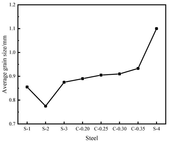 For equiaxed crystals, the PDAS is usually the grain diameter [28]. Therefore, the PDAS is used to describe the grain size of the equiaxed crystal zone of the slab. The corresponding values of the average grain size of the equiaxed crystal zone for each slab are displayed in Figure 14. According to the Equation (15), it is obvious that the addition of C, Si, and Ni increases the PDAS, while the addition of Mn, Al, and Cr decreases the PDAS. C promotes the largest increases in PDAS, whereas Al produces the strongest diminution. As for the role of Si and Mn, it is obvious that the coefficient affecting Si is one order of magnitude larger than that of Mn, indicating that Si has a greater influence on the PDAS than Mn. The average grain size of the S-2 steel is smaller than that of S-1 steel. This is mainly due to the Si content of S-2 steel being less than that of S-1 steel; specifically, it is one-third of that of S-1 steel. The simulation and experimental results show that with the decrease in Si content, the ECR in the slab increases, the number of grains increases, and the average grain radius decreases. Increasing Cr content can increase the ECR, reduce the average grain size, and increase the number of grains. The increase in Mn content serves to increase the ECR. Another important fact worth mentioning is that Mn element has little influence on the average radius of the grains, which is in agreement with some results published by other researchers [15,16].