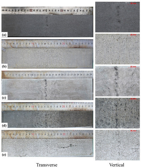 The comparison of the transverse and longitudinal morphologies of typical defects of experimental steels is shown in Figure 15. The existence of V-segregation can be seen from the cross section of the slabs after pickling. The V-segregation line will occur if (1) equiaxed dendrite crystals grow large even while the molten steel pool remains large, (2) columnar crystals grow to the vicinity of the central axis, and (3) the bridges are not ruptured, thereby functioning as an effective filter against equiaxed dendrite crystals [1]. In this actual production, under the cooling conditions described in this paper, the secondary cooling intensity is large. The casting speed is very stable and the roll spacing is small, which makes the bulging amount small and have little effect on the central segregation. Therefore, the effect of bulging on central segregation is excluded. In a low-carbon steel slab, small V-lines occur in large numbers, probably because the size of the equiaxed dendrite is small, as shown in Figure 16. This is mainly because the solidification temperature range of low-carbon steel is narrower than that of the medium-carbon steel, as shown in Figure 2d. The equiaxed crystals have a short growth period, so that they cannot fully grow.