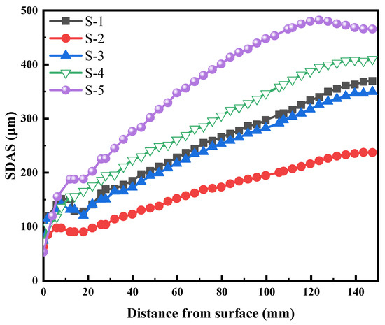 In general, the dendrite spacing is the vertical distance between dendrites. The dendrite growth morphology and SDAS determine the density and the morphology (columnar crystal and equiaxed crystal) of the solidification structure. The size of the dendrite spacing is closely related to macrosegregation, microcracks, and porosity in the solidification structure. The SDAS curves of different slabs from the slab surface to the center are shown in Figure 16. According to Equation (11), C and Si promote a larger increase in the SDAS, and conversely Al produces the strongest decrease. As for the role of Mn, Ni, and Cr, it is apparent that they have little effect on the SDAS. Although the C content of S-3 steel is higher than that of S-1 steel, the SDASs of S-1 and S-3 steel are basically equal due to the relatively high Si content of S-1 steel. Since the ECR of S-1, S-2, S-3, and S-4 steel are not much different, the main factor affecting the macrosegregation of the slab is the SDAS. The internal quality of the S-2 slab is significantly higher than that of the S-3 slab, which is mainly because smaller SDAS can reduce the frequency of central segregation. When the SDAS is 100-220 μm, the dendrite belongs to a fine dendrite structure with a small dendrite gap and a small volume fraction of enriched solute, which reduce the macrosegregation [32]. The internal quality of the S-1 slab is not much different from that of the S-3 slab, mainly because the SDAS is not much different. Although the ECR of S-3 steel is higher than that of S-1, the grain size of S-1 steel is smaller than that of S-3. For S-4 and S-5 steel, due to the large SDAS, the slab has more serious central segregation, and for S-5 steel, due to its ECR close to 0% and large grain size, the central segregation is most serious.