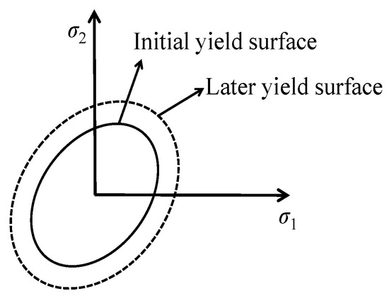 The hardening rule means that the material is loaded up to its plastic deformation stage and then unloaded, and the material’s ultimate strength is enhanced during the reloading process. In this paper, the isotropic hardening rule describes the strengthening process of materials during thermal welding analysis. The isotropic hardening rule is defined as the yield stress in each direction of the material increasing during the development of plastic strain, and the yield of the material expands uniformly in each direction [34,35], as shown in Figure 1.