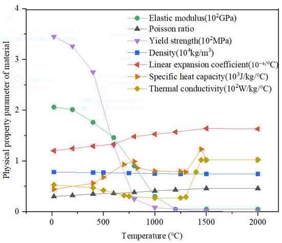 Welding finite element numerical simulation of nonlinear thermophysical parameters of the material is the key factor affecting the calculation of residual welding stress results. This study assumes that the FEM of the CSWs, steel chord plate, and welding electrodes thermophysical are made of Q345 steel. The thermophysical parameters of Q345 are shown in Figure 3, which include elastic modulus, Poisson ratio, yield strength, density, linear expansion coefficient, specific heat capacity, thermal conductivity, etc. The Stefan–Boltzmann constant is 5.67 × 10−8 W·(m2·°C4)−1 [34]. The convective heat transfer coefficient is affected by many external environmental conditions. In this study, the heat transfer coefficient is assumed to be 20 W/(m2-°C). The radiation heat transfer coefficient, which may be considered to be the proportion of energy stream through the space at the speed of light, and its value is taken as 0.8 in this study [34]. Moreover, the ambient temperature at which the weldment is located is taken as 20 °C.