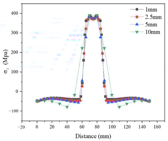 The weldment size was established according to Figure 2. Indeed, using a small size global seed will result in accurate simulation; however, it will seriously affect the computational efficiency and cost. In order to ensure the calculation accuracy, this paper establishes four different grid sizes of the flat plate welding model and obtains the longitudinal residual stress results of each model, as shown in Figure 4. It can be seen that when the grid size is 10 mm, the stress distribution near the weld has a large deviation, and when the grid size is reduced to 5 mm, 2.5 mm, and 1 mm, the stress distribution is completely consistent and the maximum stress resulting in good agreement with the data.