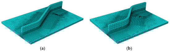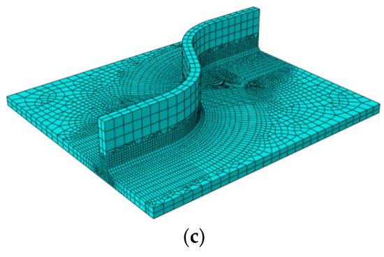 In summary, in this study, the mesh size was set to 2.5 mm near the weld, 10 mm away from the weld, and at least two transition zones were divided into other areas to achieve the transition of the mesh size from the transverse and longitudinal directions. The smallest element in such a region was 0.9 mm × 1.0 mm and the number of elements is 29224. The C3D8 element, defined by eight nodes having three degrees of freedom at each node, was used for 3-D modeling the corrugated web. The mesh division models of weld parts with 30°, 45°, and 60° ripple angles are given in Figure 5a–c, respectively. It is worth noting that in order to implement the element birth and death technology with high efficiency, the weld mesh needs to be divided separately. The mesh number with certain regularity along the welding path is obtained by using hexahedral sweep division.