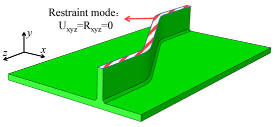 Calculating the temperature field is only a heat transfer process and does not produce rigid displacement at the spatial location. The process does not require setting displacement boundary conditions, while the calculation of the stress field must consider the impact of the deformation of the weldment on the results of the stress field and must give the weldment a displacement boundary condition, while not seriously hindering the development process of residual stresses in the weld at the details of attention, and finally impose thorough consolidated boundary conditions on the steel web away from the weld area, as shown in Figure 6.
