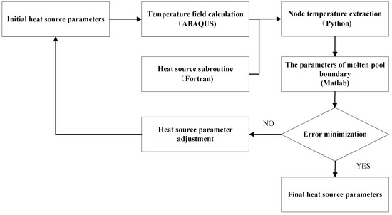 The assumed shape parameters of the heat source were verified by comparing the shape of the simulated molten pool with the actual molten pool. The comparison parameters mainly refer to the width and depth of the molten pool. In this study, the initial heat source parameters were set to simulate the temperature field in ABAQUS. The boundary between simulation results and the actual molten pool is compared. In order to calibrate the model, the initial heat source parameters were adjusted, and the above steps were repeated until the simulation results were consistent with the actual molten pool boundary. The calibration approach is shown in Figure 8, and the optimization model of heat source parameters is as follows:
