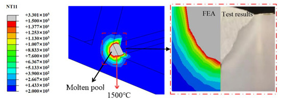 Figure 9 compares the simulation and experiment welding pool in reference [36]. Table 2 lists the comparison of width and depth of welding pool parameters between test data and FEA data. It shows that the simulated molten pool parameters are in good agreement with the experimental parameters. Moreover, Table 3 lists the final parameters of welding heat sources.