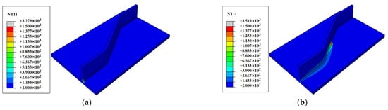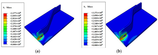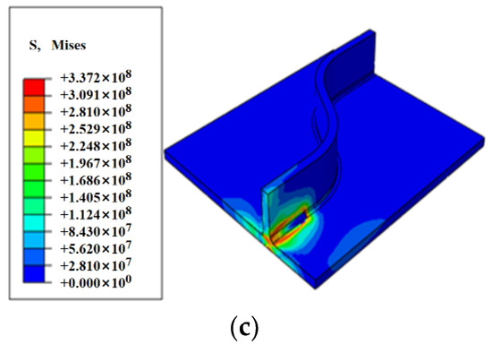 Figure 15 shows the welding Von Mises stress cloud during the welding process for CSWs with fold angles of 30°, 45°, and 60°. It can be seen that the stress distribution during the welding process of the three models is the same. In addition, with the movement of the heat source welding, residual stress changes sharply, and the location of the maximum stress is mainly distributed in the weld toe area near the heat source. The maximum Von Mises stress is approximately 337 MPa, while the stress in the center of the heat source tends to be 0 MPa.
