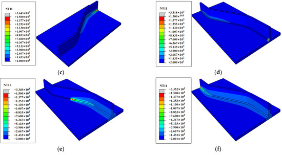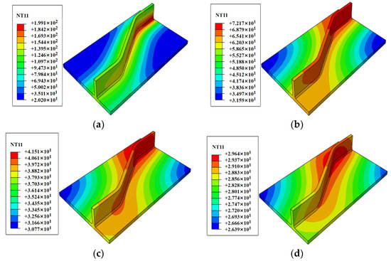 Figure 10 shows the time course of the temperature field cloud diagram during the welding phase of the weldment and the entire welding process for 346 s. It can be seen that the distribution of the temperature field on a double-sided welding weldment with a 30° corrugated angle depends on the location of the moving heat source, with the temperature in the area where the heat source arrives rising rapidly to exceed the melting point temperature of the steel (approximately 1500 °C), gradually decreasing in the high-temperature area as the heat source gradually moves away, and then rising again when the second weld passes over the area due to the difference in the location of the heat source center.