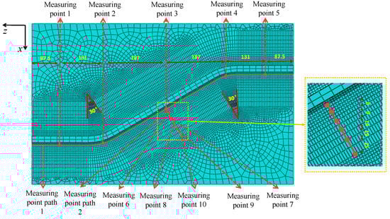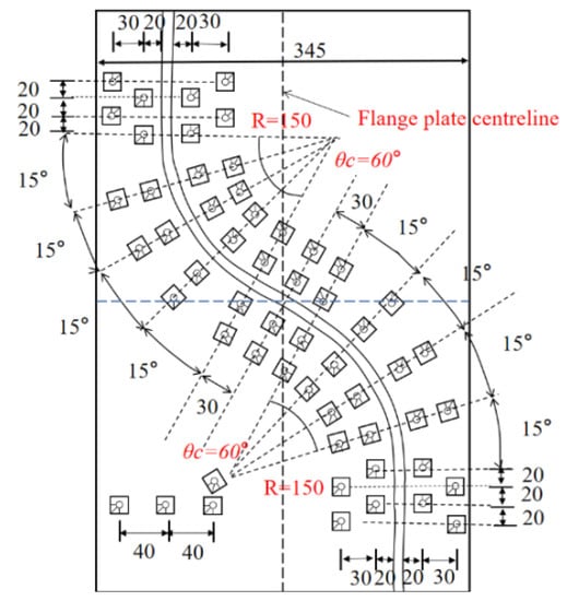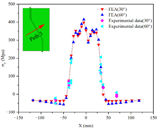In order to verify the accuracy of the numerical welding simulation, the experimental data in the literature [26] was used. The parameters of CSWs components tested were “θc = 30° and Rt = 75 mm” and “θc = 60° and Rt = 150 mm”, respectively. The welding process was performed by semi-automatic gas metal arc welding (GMAW) method with CO2 protection. Each group was tested in triplicate. Figure 17 shows the layout of the residual stress and strain test of welded members. Figure 18 compares the test data and the simulated result of CSWs welding’s residual stress with bend angles of 30° and 60° in the X direction. It can be seen that the finite element simulation results agree with the experimental data. Moreover, it shows that the finite element analysis method and parameter setting of the thermocouple proposed in this paper are effective.