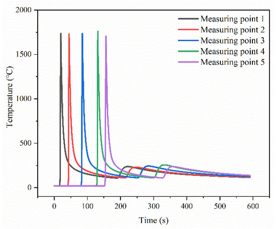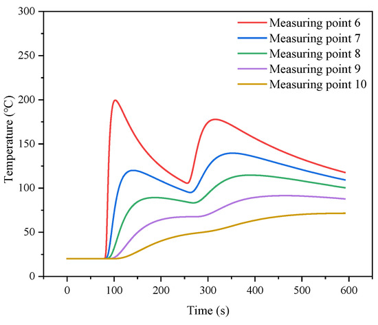 Figure 12 shows the first welding path with measurement point 1 to point 5 in path 1, which includes the center of the straight edge, the center of the corner area, and the center of the oblique straight edge. In order to study the temperature field course changes away from the weld region, Figure 12 shows the measurement from points 6 to 10 in path 2. Figure 13 shows that the temperature of each measurement point in path 1 changes with the movement of the heat source. When the heat source moves near the measurement point, the temperature of the measurement point rises sharply to approximately 1700 °C. Furthermore, the temperature shows a rising trend, with the heat source in the second weld being close to the measurement point. Figure 14 shows the temperature–time history curve of the measurement points in path 2. It can be seen that the temperature peak decreases as the measuring point moves away from the weld.