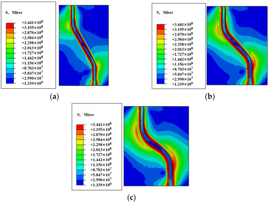 Stress field contour plot after cooling (Unit: Pa); (a) Stress field (30°); (b) Stress field (45°); (c) Stress field (60°).