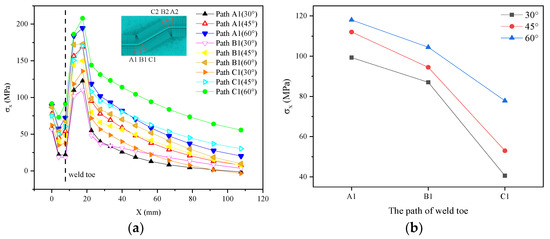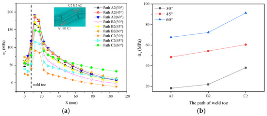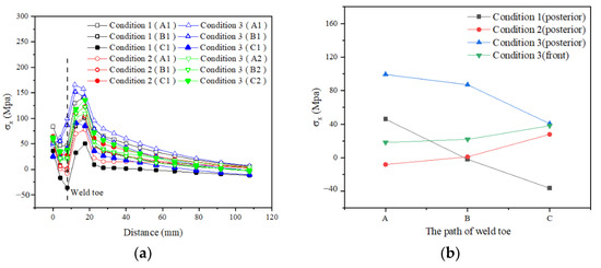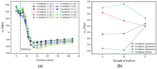 Residual stress distribution of σx in different welding conditions. (a) Along the path direction; (b) Position of weld toe.