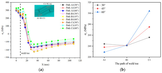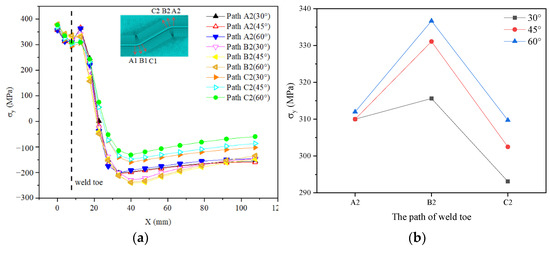 Residual stress distribution of longitudinal path posterior weldment. (a) Along the path direction; (b) Position of weld toe.