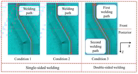 To study the impact of different welding processes on the residual stress of welding, three types of welding path conditions, two single-sided welding paths and a double-sided welding path, are established in Figure 23. Figure 24a shows the difference in residual stress distribution on single-sided welding of conditions 1 and 2. It indicates that the second weld near the welding’s residual stress has a greater impact. Therefore, it can be assumed that the second weld (the last weld) plays a critical role in residual stress distribution. The reason for this is that the heating process of the second weld affects temperature, which allows the redistribution of the peak residual stress location in the weld. Figure 24b shows the stress distribution in the y direction of the CSWs weldment with conditions 2 and 3. It can be seen that the distribution of welding residual stresses and longitudinal welding residual stresses of the single-sided weldment in path 2 is completely consistent with that of the double-sided weldment. However, there are certain differences in stress values, which indicates that the welding process of the first weld on the second weld near the welding residual stress distribution has a low impact.