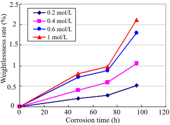 The weight loss rate of the sample has a linear relation with the immersion time, as shown in Figure 2. The rate of weight loss sharply increases, and the corrosion rate accelerates with the rise of the immersion time. The corrosion gradually gets serious, but the corrosion rate starts to get slow due to the corrosion product film forming on the surface of the sample, which has the passivation effect. In addition, later, the protection of the corrosion passivation disappears and sharply accelerates the corrosion effect of Cl− to the body of the substrate as time increases. The weight loss rapidly increases again, and corrosion becomes more serious. The corrosion products formed on the surface of the 13Cr stainless-steel sample immersing in the solution with different Cl− concentration for different time. The Cl− concentration in the NaCl solution is higher; the corrosion products formed under the same immersion time are much more. The corrosion rate increased with the increase in the Cl− concentration, and the corrosion aggravated.