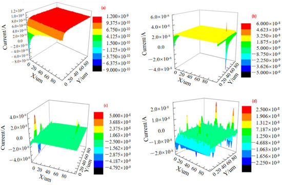 According to the literature, the oxidation of hydrogen decreases the pH value between the metal substrate and the interface of the passivation membrane. Therefore, the proportion of was improved. The higher the , the lower the pitting-resistance property of the passivation membrane. Moreover, the material was easy to be corroded by Cl−. The clear figure can be obtained by SECM technology through detecting the current variation of Fe2+ in this area. This is because the concentration of Fe2+ in the pitting site was higher than those in the other sites when pitting occurred.