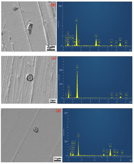 When the SECM test was over, the micromorphology of the samples was observed by a scanning electron microscope. The results showed that pitting corrosion firstly occurred in inclusions. The morphology of the inclusions includes strip (Figure 5a,b) and round inclusions (Figure 5c,d). The area containing strip inclusions on the surface of the sample displayed serious pitting corrosion. It should be known that the inclusions were oxide inclusions of the aluminum and FeAlx phase according to the analysis of the energy spectrum (EDS) test. Table 1 shows the EDS results of the inclusions from Figure 5a–d.