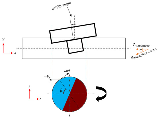 It should be mentioned that the literature [5,18,19] claimed that, after applying the tilt angle, the contact area also rotates across the x-direction (Figure 6). This rotation does not affect the geometry of the contact area; however, according to Equation (16) to Equation (18), it significantly affects the material flow velocity.