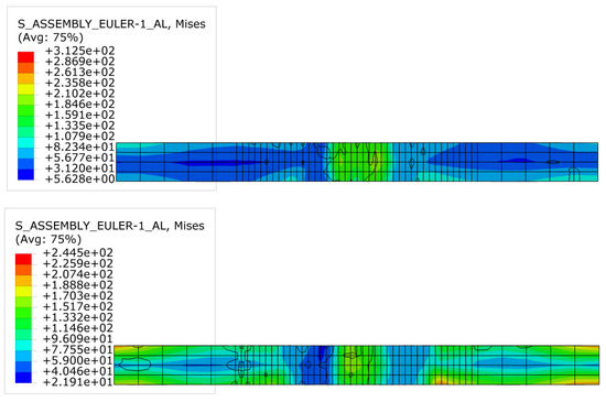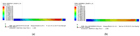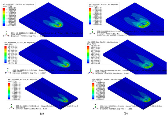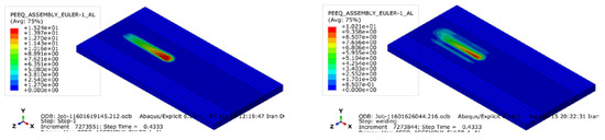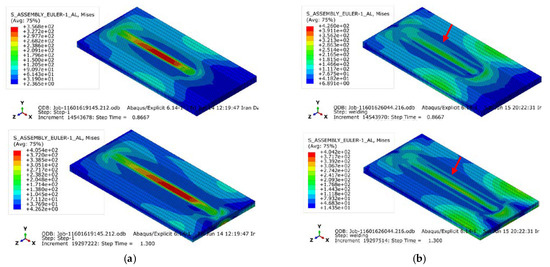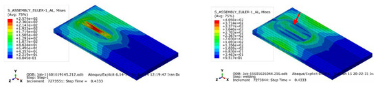 Figure 9 shows the distribution of the stress before and after applying the tilt angle. As can be seen in Figure 9a, the maximum stress is concentrated at the welding seam. However, the tilt angle caused an almost asymmetrical behavior for the stress distribution. As highlighted in Figure 9b, the tilt angle produced a rotation of the stress distribution trending to the advancing side. Moreover, the stress values for the model with the tilt angle at the step time of 0.4 and 0.8 s is around 257 and 356 MPa, respectively. After applying the tilt angle, these values increase to 405 and 426 MPa. The abovementioned issues are caused because the tilt angle increases the forces at the rear part of the advancing side, thus the maximum stress moves from the center of the welding to the advancing side. Moreover, this movement facilities the material softening and decrease of the material flow stress. This result agrees well with the presented results of the literature [29].