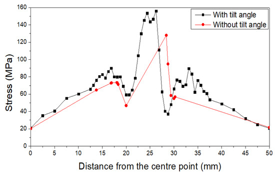 Figure 10 indicates the cross-sectional view of the stress distribution for the finite element models. As can be seen, at the center of the welding both models show an almost similar behavior. As the distance from the welding center line in the model in which the tilt angle of 1.5° increases, a more compressive stress behavior is observed.