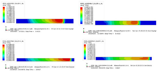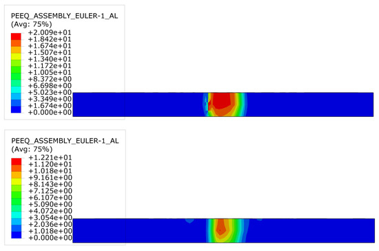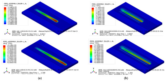 Figure 14 shows the longitudinal view of the equivalent plastic strain during the welding. As can be seen, a better bonding of the material at the pin bottom area is happening in the model with the tilt angle (Figure 14b). In contrast, the deformation of the material at the pin root in the model without the tilt angle has not been completely done. This issue indicates a failure in the disposition of the material, which may lead to the formation of a void.