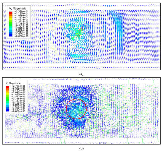 The top view of the material flow velocity streamlines around the tool under two different conditions of the tilt angle are shown in Figure 16. It is found from the results of both models that the outside of the shoulder area, the transportation of the material mainly takes place at the retreating side. This asymmetrical behavior is happening because of an unbalanced behavior of the forces at different sides of the welding. Moreover, the expansion of the flow region especially at the retreating side gets larger after applying the tilt angle. In contrast, at the advancing side, a flow reversal or a stagnant zone can be seen. The abovementioned observations are in line with the reported results of the literature [5,37]. Figure 16b shows that the density of the streamlines is increased significantly.