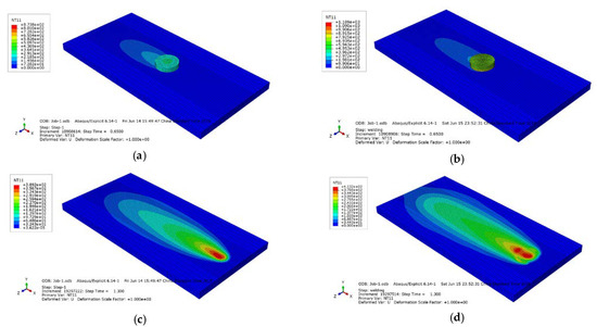 The temperature distribution at the welding surface in the model (a) with the tilt angle including the tool, (b) without the tilt angle including the tool, (c) with the tilt angle step time 1.3 s, and (d) without the tilt angle step time 1.3 s.