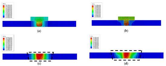 Figure 17 explains the distribution of the temperature before and after applying the tilt angle in both models. Figure 17a shows that, before applying the tilt angle, the temperature at the tool interface is found to be around 873 °C. From Figure 17c, it can be seen that as the generated heat is balanced with the heat dissipated, the temperature at the welding center point reaches the highest point (389 °C). Calculating the temperature at the interface of the tool and the distribution of the temperature at the adjacent places of the welding joint is made while the welding tool with 1.5° tilt angle is set (Figure 17b,d). Figure 17b,d indicates that the temperature at the welding tool is about 1118 °C, at the welding zone is around 413 °C, and 3 mm away from the welding is around 300 °C. As can be seen, the value of the temperature in this model is slightly more than the model without the tilt angle. The literature [19] reported that, due to the enhanced temperature and strain behaviors, after applying the tilt angle the mixing of the material will be improved, therefore the welding quality should be better, and the possibility of the defect will be decreased. To illustrate more, as the pin penetrates into the sheets, a movement for the volumetric heat source region occurs. Under these conditions, the material remains solid, thus no welding defects will be formed. Furthermore, higher generated heat in the back side of the weld assists in better material bonding and full embodiment of the material. Hence, it can be predicted that the presented model with the tilt angle is a free defect model.