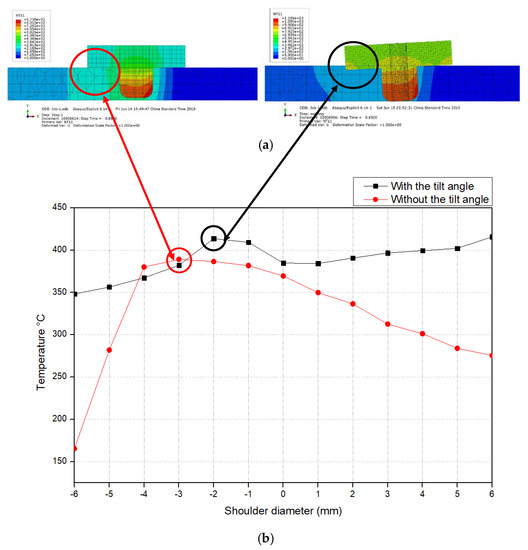 Another significant issue that needs to be considered is preheating performed by the welding tool, because it has an influence on the formation of cracks and voids inside the welding zone. In order to simplify the model in the literature [34,38] a uniform behavior for this preheating is considered for different models with and without the tilt angle. Figure 19 shows that preheating caused by the welding tool is higher in the model with the tilt angle. To illustrate the issue, due to the larger geometry of the contact area and larger values of the frictional force, the preheating in the model with the tilt angle is higher. Therefore, higher values of the preheating in the model with the tilt angle indicates that the accuracy of the results of this study is higher than the presented models in the literature [34,38]. Moreover, Figure 19b indicates that there is a smooth preheating behavior in the model with the tilt angle which leads to the uniform formation of the microstructure, while in the model without the tilt angle, the temperature is increased sharply which results in the formation of defects inside the welding zone. Thus, it can be predicted that the welding quality in the model with the tilt angle is higher.