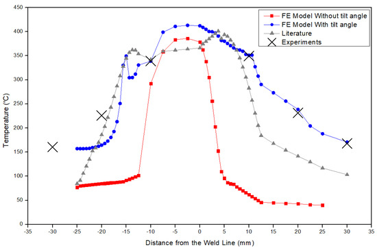The temperature curve across the cross section of the welding in both models (with and without tilt angle) along with the experimental results of the literature [39], and published literature is shown in Figure 20. As shown, the maximum value of the temperature is located inside the welding zone and the temperature decreases gradually through the heat affected zone (HAZ) until the weldment edge that is located away from the center point.