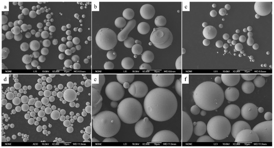 Morphology of atomized powder obtained at 1700 °C with different compositions (SEM).(a) Sample 1; (b) Sample 2; (c) Sample 3; (d) Sample 4; (e) Sample 5; (f) Sample 6.