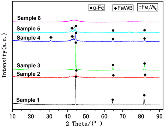 XRD patterns of atomized powder with various compositions at room temperature are shown in Figure 3. The XRD pattern of Sample 6 displays a broad peak between 35° and 55°, indicating the existence of particles with an amorphous character. It reveals that only Sample 6 shows an amorphous phase (named as Fe-W-B amorphous phase), while other types of powder show crystallized phases or the coexistence of an amorphous phase and crystalline phase. The crystallized phases mainly contain α-Fe or mix with a small number of WxFeyBz-type phases, such as FeWB and Fe7W6.