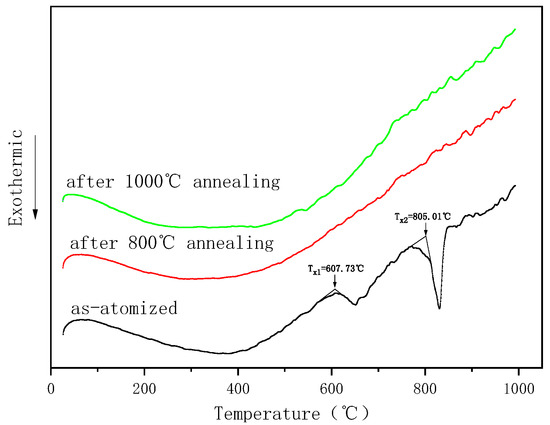 The thermal stability of Fe-W-B amorphous powder was investigated by DSC, and the DSC curves of as-atomized and annealed Fe-W-B amorphous powder are shown in Figure 5. The DSC traces exhibit exothermic reactions corresponding to the crystallization of Fe-W-B amorphous powder as atomized. It shows a two-step process for the crystallization of amorphous structure. The first crystallization temperature (Tx1) of Fe-W-B amorphous powder is determined to be 607.73 °C, and the second crystallization temperature (Tx2) is determined to be 805.01 °C. After annealing at 800 °C or 1000 °C, the DSC curves show no exothermic reactions because Fe-W-B amorphous powder has completed the crystallization process, which is also consistent with the previous XRD analysis.