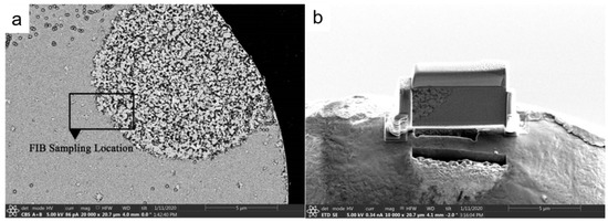 TEM sample image of Fe-W-B amorphous powder annealed at 700 °C. (a) FIB sampling location image; (b) FIB sample image.