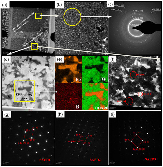 Microstructure of Fe-W-B amorphous powder annealed at 700 °C (TEM). (a) TEM sample image; (b) Microstructure morphology of the amorphous-nanocrystalline dual phase region; (c) SAED pattern of the amorphous-nanocrystalline dual phase region; (d) HAADF image of the fully crystallized region; (e) EDS microanalyses of the fully crystallized region; (f) HRTEM morphology of the fully crystallized region; (g) SAED pattern of “SAED1” within the fully crystallized region; (h) SAED pattern of “SAED2” within the fully crystallized region; (i) SAED pattern of “SAED3” within the fully crystallized region.