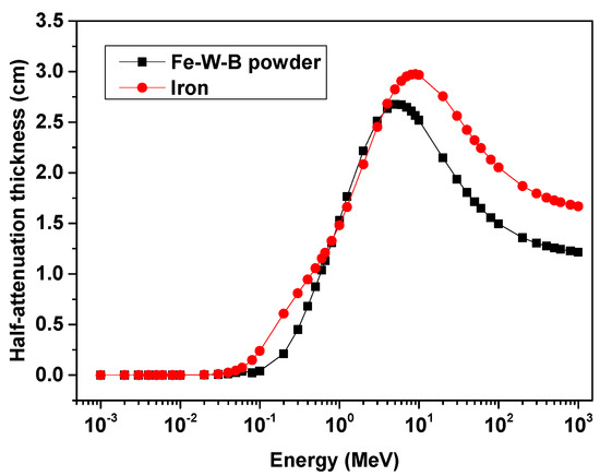 The comparison of half attenuation thickness of Fe-W-B amorphous powder and iron under different γ-ray energy conditions.