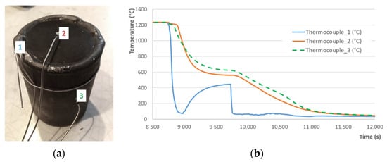 (a) A welded container with fixed K-type thermocouples for temperature measurement; (b) a record of the temperature during the hardening of the container in water.