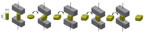Austenite is soft, and the ledeburitic network is very brittle. Therefore, it was necessary to fragment the mesh and distribute it evenly among the austenitic grains. To achieve higher wear resistance, it was further necessary to refine the austenitic grains, transform them into martensite, and promote secondary precipitation of fine carbides. This was performed by forging on a hydraulic press, where the insertion of the deformation in 3, 5, or 10 steps was tested (regimes: 3 × def., 5 × def., 10 × def.), (Table 2, Figure 3 and Figure 4a). The reduction size was 55 mm at each step, and the upsetting and elongation steps were alternated so that the semi-finished products were deformed on all sides.