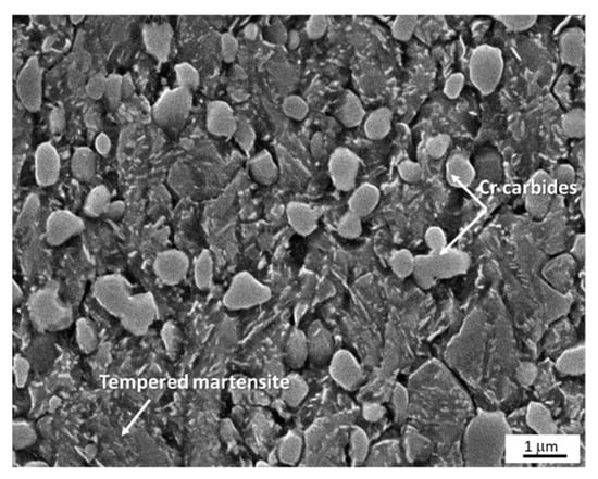 In addition to the samples processed by the proposed procedures with the transition through the semi-solid state, the experiment was also supplemented with a baseline condition (Figure 16c) and with the condition after conventional heat treatment. The treatment consisted of oil quenching from 960 °C and tempering to 250 °C for 2 h. The processing parameters were selected based on data from the material data sheets [,,]. The structure was composed of tempered martensite and chromium carbides. The hardness was 716 HV10 (Figure 17, Table 5). The sandblast test was also performed on Hardox 450 and Hardox 600 materials, which are currently used in the chambers of crushers and tumbling machines. These are high-quality martensitic steels with high wear resistance [,,], (Table 5). They were tested as delivered with hardness values of 465 HV10 for Hardox 450 and 660 HV10 for Hardox 600 (Table 6).