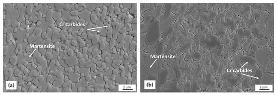 A further reduction in the austenite fraction was achieved by tempering at 300 °C/2 h. There was also a general tempering of the martensitic structure (Figure 7b), which was reflected by a decrease in the hardness value to 844 HV10. The grain size in both cases was 1.4 μm.