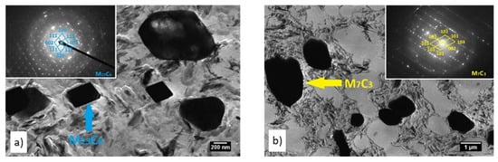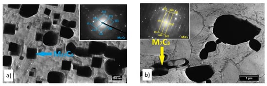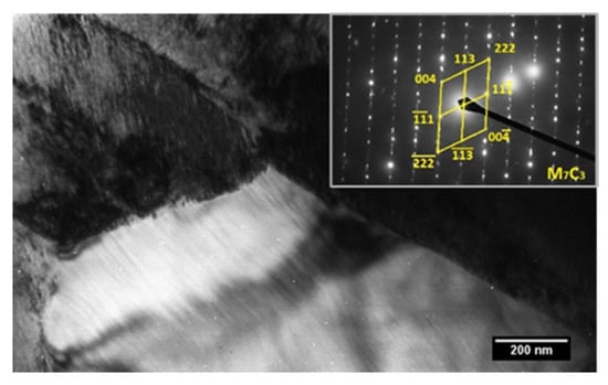 Based on the solution of the diffraction spectra, the large irregular shaped particles were identified by electron diffraction as M7C3 carbide. On the contrary, regular geometric-shaped particles were identified as M23C6 carbide (Figure 7).