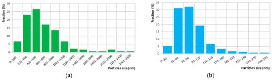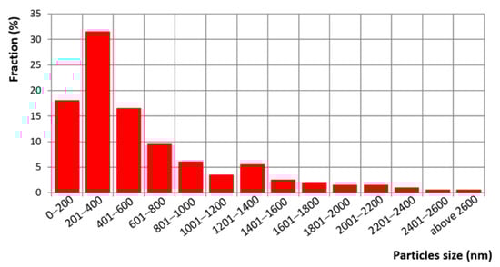 Analysis using carbon extraction replicas confirmed strong precipitation of particles with different morphologies and sizes (Figure 8). Two types of regions were observed, differing mainly in particle character. These were areas with particles of a regular geometric shape with a high density of precipitates and areas where large particles of irregular shape were precipitated. Due to the size of the particles, there was low extraction into the replicas. In most cases, the presence of particles can be predicted from the indentation left in the replica. Based on statistical analysis, it can be concluded that the particle size range was very wide, ranging from 15 to 4000 nm (Figure 9, Table 3). The histogram of the particle distribution shows a wide interval. One maximum is between 200 and 400 nm and the other between 1200 and 1400 nm.
