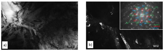 Structural analysis using the thin film method confirmed that the matrix is composed of martensite with very fine needles with an increased density of dislocations or twins (Figure 10a). TEM analysis also confirmed the presence of retained austenite, which was detected between the martensite needles (Figure 10b). Larger irregularly shaped particles were identified as M7C3 carbide. In these particles, an increased density of stacking faults was usually observed, which was also reflected in the character of the diffraction points, where deformation in the form of “streaks” was detected due to lattice stresses (Figure 10b and Figure 11). Smaller geometric-shaped particles were identified as M23C6 carbide (Figure 10b).