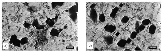 Next, the sample was analyzed after cryogenic treatment and tempering at 300 °C for 2 h. Structural analysis using carbon extraction replicates showed more significant precipitation than the sample without tempering after cryogen treatment. In addition to large irregular-shaped particles and smaller regular-shaped particles, fine needle-like particles were observed in the matrix, which were mainly precipitated at the boundaries of the martensite laths (Figure 12). The density of the precipitated needle-like particles showed moderate heterogeneity. Large clusters of these particles with different orientations were observed (Figure 12a) or individual needles with precise geometrical orientations (Figure 12b).