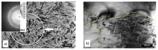 The thin-film method confirmed that the matrix is composed of tempered martensite with very fine lamellae and an increased density of dislocations or twins (Figure 14b). Larger irregularly shaped particles were identified as M7C3 carbide. Fine needle-like particles were observed in the matrix and were identified as M3C carbide.
